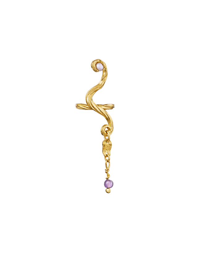 Beskrivelse: Det siges, at den lilla Ametyst kan åbne det indre øje og hjælpe til at finde klarhed og retning i livet. Dens indsigtsfulde og kreative energi er integreret i denne finurligt snoede ear cuff, der snørkler sig om øret med gylden elegance og graciøst drypper under øreflippen, hvor den dragende ametyst danner et smukt, svævende punktum for Elva ear cuffen.