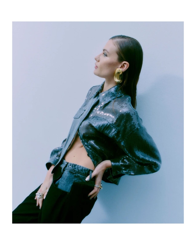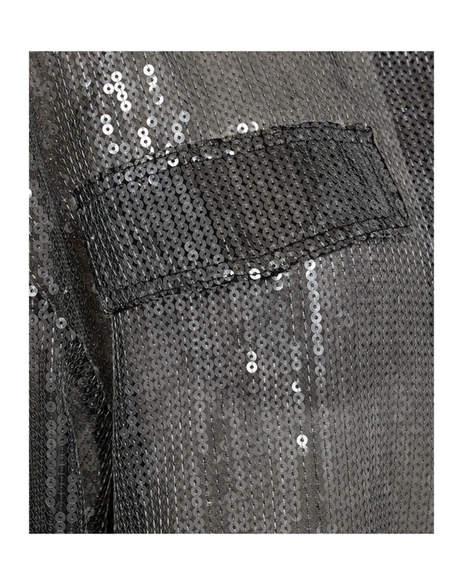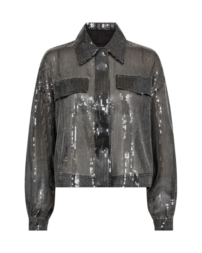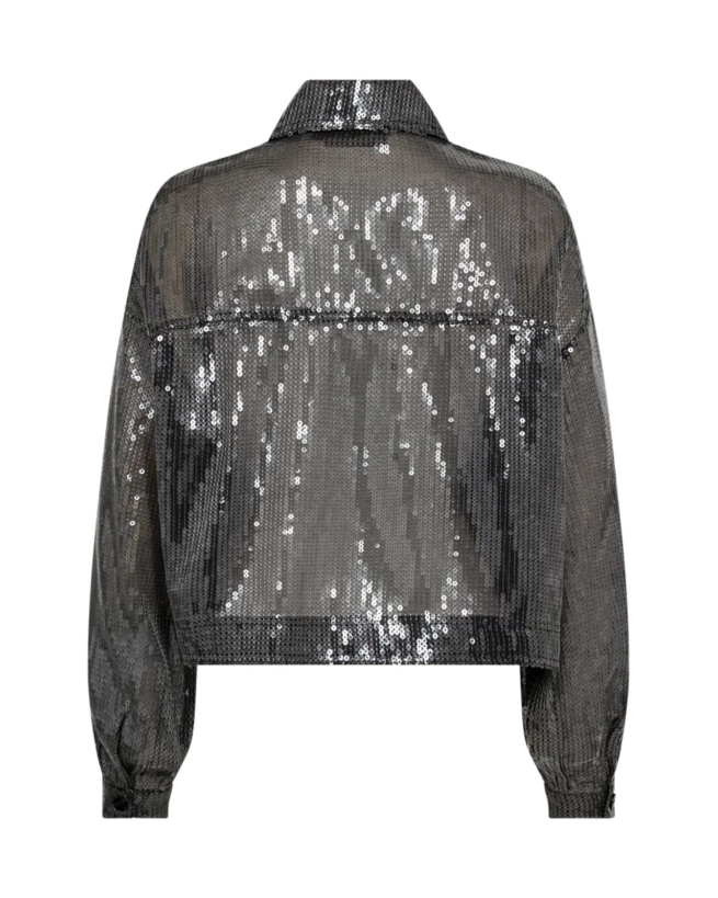 Beskrivelse: Jakke i en transparent kvalitet med pallietter. Jakken har løse ærmer, en skjult lukning på fronten, brystlommedetaljer samt lange ærmer.