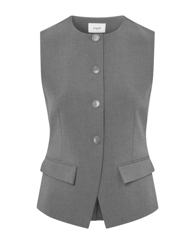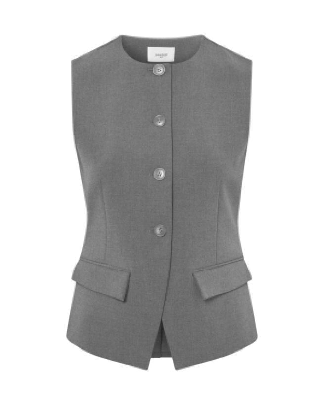 Beskrivelse: Elegant vest i en dyb mørkegrå nuance, designet i en tætsiddende slim fit-pasform for et moderne og feminint udtryk. Modellen har rund hals, klassisk knaplukning og paspolerede forlommer med flap, der tilføjer et stilrent og sofistikeret look. Perfekt til lag-på-lag styling – både til hverdag og mere formelle anledninger.