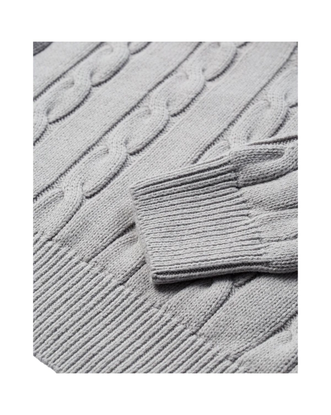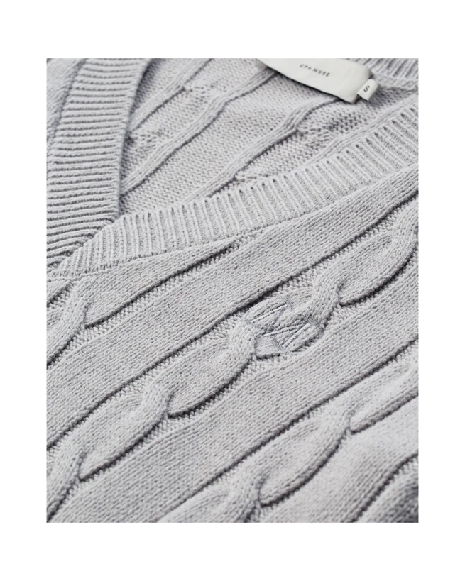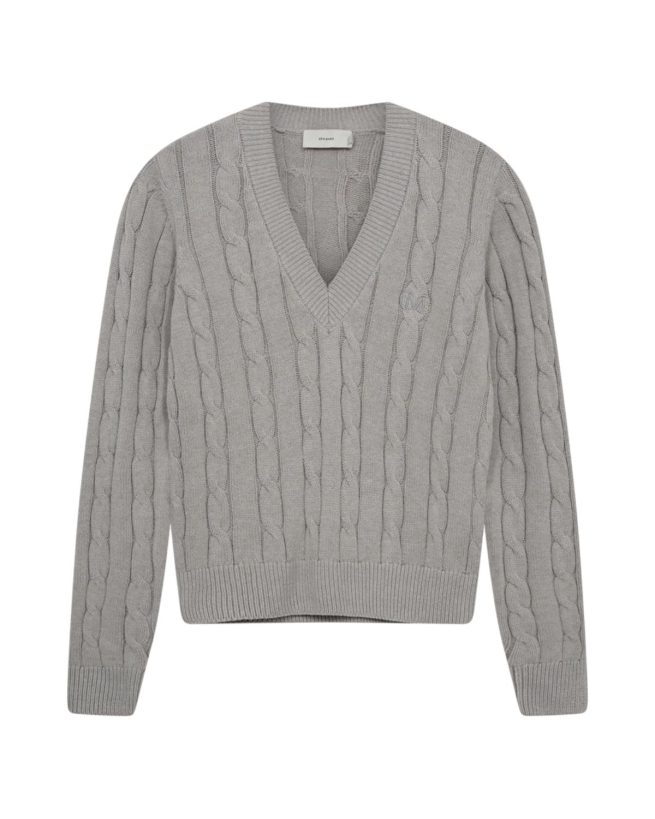 Beskrivelse: En eksklusiv kabelstrikket pullover med lange ærmer, V-udskæring og ribkanter. Den er afsluttet med en diskret broderet logodetalje på brystet, der giver et stilfuldt og tidløst udtryk.
