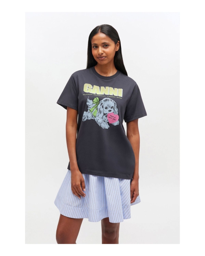 Beskrivelse: T-shirt med rund halsudskæring og korte ærmer, prydet med GANNI-logo. Den har et grafisk hvalpeprint samt teksten "Have a nice day! Please recycle!", der giver et legende og moderne udtryk.
