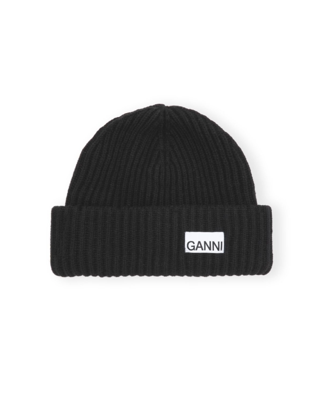 Beskrivelse: Ribstrikket hue med foldet kant og ikonisk GANNI-logo patch. En stilfuld og praktisk accessory, der fuldender dit look på kølige dage.
