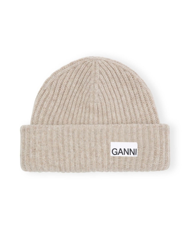 Beskrivelse: Ribstrikket hue med foldet kant og ikonisk GANNI-logo patch. En stilfuld og praktisk accessory, der fuldender dit look på kølige dage.