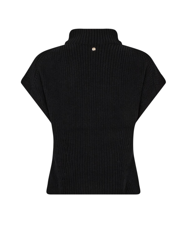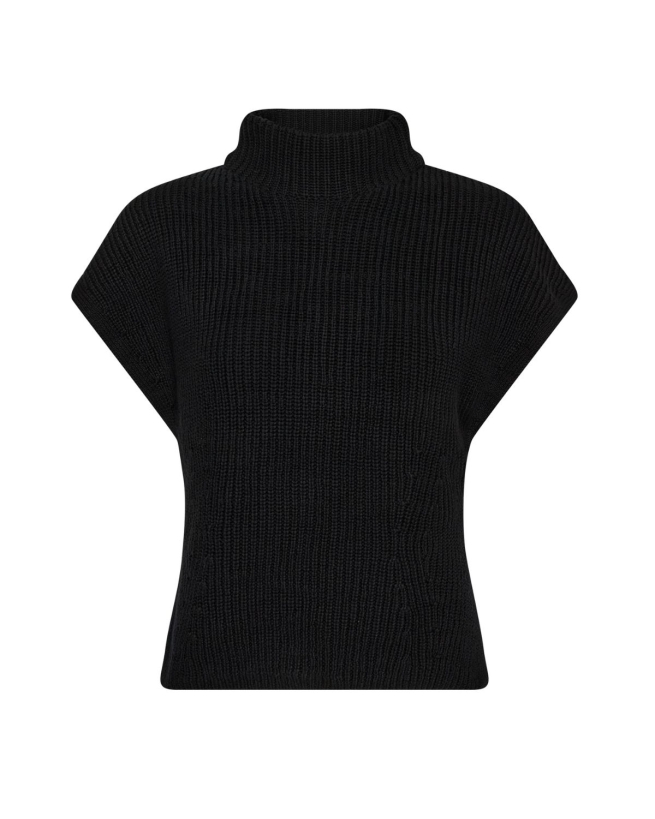 Beskrivelse: Strikvest med tætsiddende silhuet og høj hals, der skaber et moderne og elegant udtryk. Perfekt som lag-på-lag over en skjorte eller som statement-piece med skræddersyede bukser.
