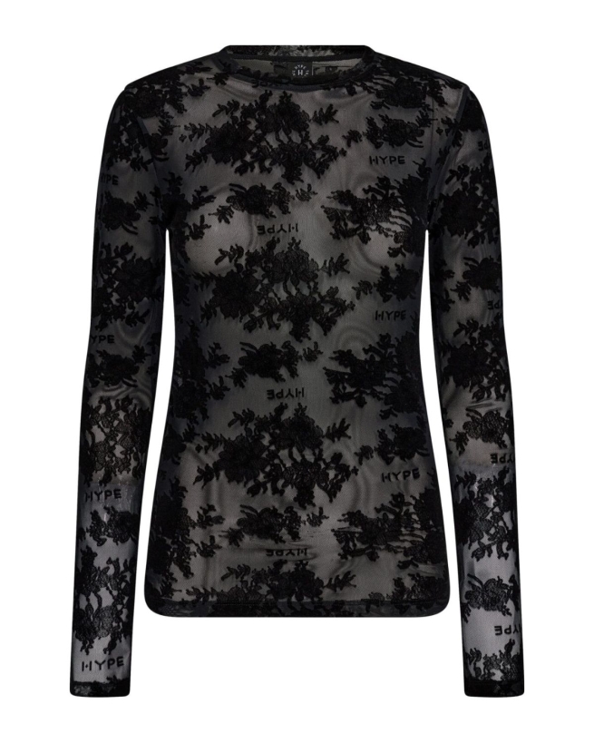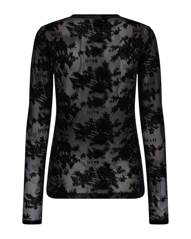 Beskrivelse: Sort blondebluse med blomstermønster og diskret HYPE-tekst i stoffet. Blusen har rund halsudskæring og lange ærmer, der skaber et elegant og gennemført look.