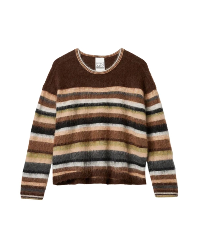 Beskrivelse: Denne sæsonbetonede pullover er strikket i en børstet mohairblanding, der giver volumen og varme uden at føles tung. Den har en afslappet pasform med sænkede skuldre og en afrundet halsudskæring med fine kontrastdetaljer. Det markante flerfarvede stribemønster gør den til en stærk stilerklæring, og den kan nemt matches med den tilhørende hue for et komplet look.