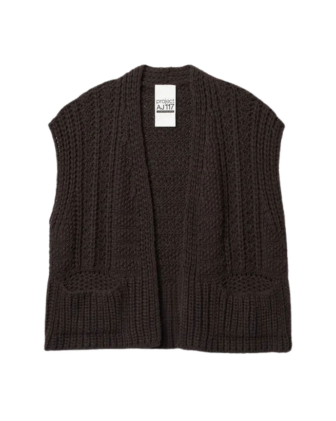 Beskrivelse: SUSIE er en chunky, strikket vest med en blød, tekstureret overflade og en afslappet silhuet. Designet har en åben front, sænkede skuldre og to påsatte frontlommer, som giver et afslappet og funktionelt udtryk.. Vesten har brede ribkanter og en let cropped facon, der gør den ideel til lag-på-lag styling over skjorter eller strik. Et alsidigt overgangsstykke med både komfort og karakter.
