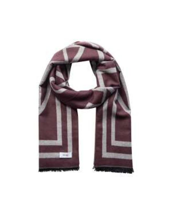 Elegant stort let uldent tørklæde fra LEVETÈ ROOM med et geometrisk print med rene kanter og frynsede ender for ekstra tekstur. Brug det sammen med skræddersyede frakker eller afslappede jakker for et raffineret look.Farve: 418 BORDEAUX/GRÅ