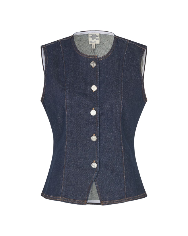 Beskrivelse: Mene-toppen er en ægte denimklassiker lavet i økologisk bomuld Skræddersyet tætsiddende silhuet Rund hals Klassisk knaplukning Raffineret og tidløst design Kan styles med nederdele eller matchende jeans