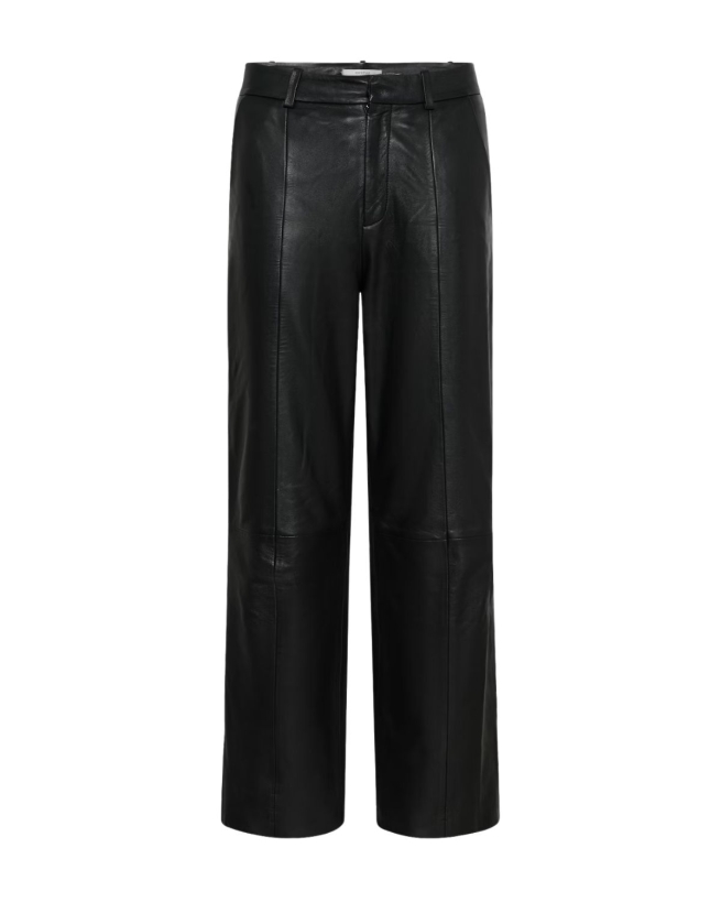 Beskrivelse: Disse bukser er fremstillet i ægte lammelæder og har lige ben, mellemhøj talje og pressefolder. Med skrålommer foran, paspolerede baglommer og bæltestropper for et sofistikeret look.