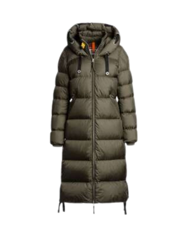 Panda er en ekstra lang dunjakke fra PARAJUMPERS. Jakken er lavet af 15-denier nylon micro ripstop med en vandafvisende belægning. Foringen er af genanvendt 20-denier nylon taffeta, som er dun-sikkert og let. Jakken har en tovejs lynlås, to ydre lynlåslommer og to indre mesh-lommer for praktisk opbevaring. Den har elastiske ribbede manchetter, justerbare hætte og slidser i siden med snøre. Jakken har de karakteristiske Parajumpers-patch og den ikoniske gule tape ved halsen.Sæson: Efterår / Vinter