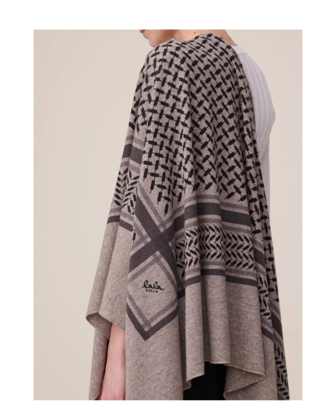 Beskrivelse: Et stort, luksuriøst blødt, håndlavet tørklæde i 100% cashmere, formet som en trekant. Tørklædet har et klassisk sort Kufiya-print på en mørkegrå baggrund. Det er fremstillet med silk screen-tryk og består af fintstrikket cashmeregarn med en non-pilling finish, som sikrer en langvarig blødhed og et elegant udtryk.