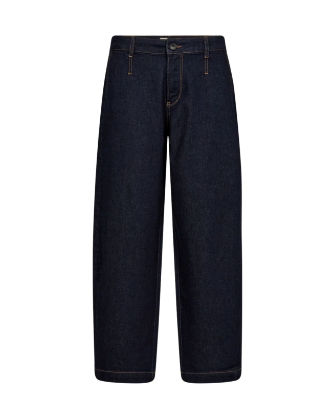 Disse chino-inspirerede jeans er designet i en afslappet mom-pasform med høj talje og en dyb mørkeblå vask, hvor brune kontrastsyninger tilføjer et subtilt, stilfuldt touch. Baglommer med klap fuldender det klassiske, men moderne udtryk. Perfekte sammen med en farverig sweatshirt og sneakers for et afslappet, cool hverdagslook.