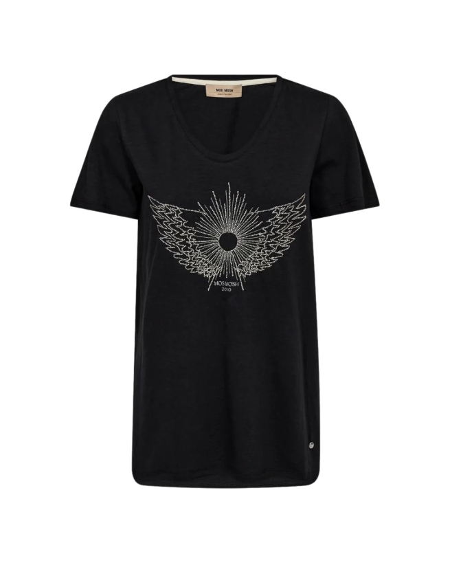 Denne T-shirt kombinerer afslappet komfort med et diskret glimmerlook. Den har en regular fit pasform, feminin V-udskæring og et funklende vingemotiv med solstråle-detaljer på fronten, hvilket giver et elegant og legende touch til hverdagsgarderoben.