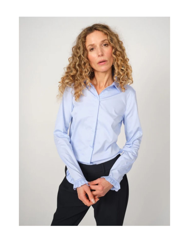BESKRIVELSE: Vil du tilføje et feminint touch til din garderobe? Denne skjorte er designet i en slank silhuet af ultra-blødt, strækbart materiale og har en traditionel krave, elegante flæsemanchetter og en klassisk knaplukning. Brug den sammen med strukturerede styles og lad de charmerende flæsemanchetter titte frem under ærmerne for et sofistikeret look.