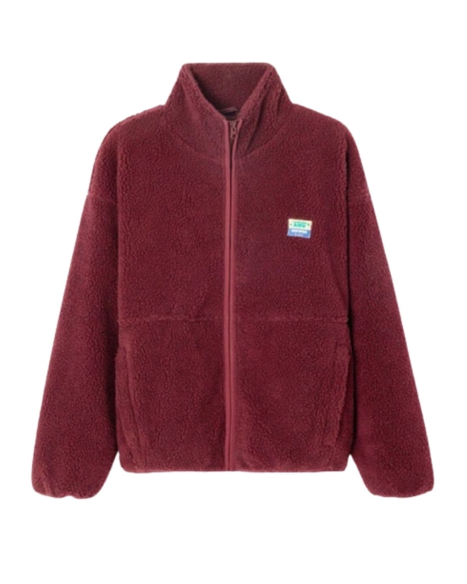 Boucléjakke fra American Vintage i bordeaux meleret kvalitet med lynlåslukning foran, sidelommer med lynlås, høj krave og elastikafslutning ved ærmerne. En klassisk jakke med normal pasform, der kombinerer stil og komfort.