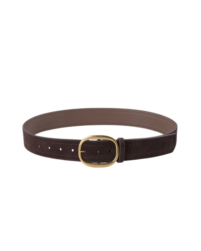 Et elegant ruskindsbælte med et ovalt messingspænde, der giver et klassisk og eksklusivt udtryk. Det bløde ruskind kombineret med læderbagsiden sikrer god holdbarhed og et luksuriøst finish – perfekt til både jeans, kjoler og lag-på-lag looks.