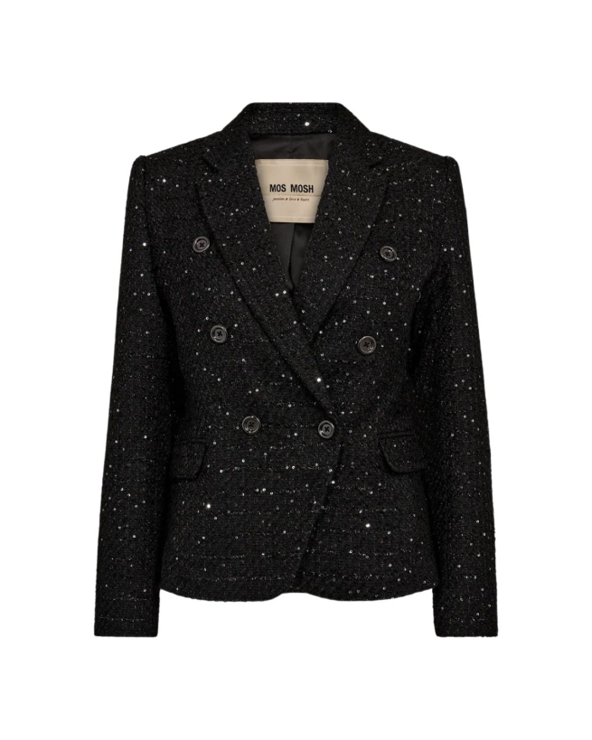 Denne iøjnefaldende blazer er syet i et struktureret bouclé-stof med diskret glimmer, der tilfører et sofistikeret og glamourøst udtryk. Den dobbeltradede silhuet med skarpe tailored detaljer skaber et tidløst look, som kan styles både til aftenens arrangementer eller med jeans og elegante bukser for et mere afslappet, men stadig sofistikeret outfit.