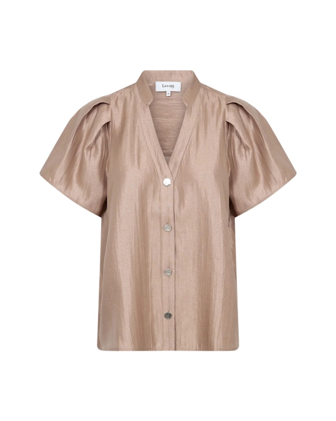 LR-OLGINE 1 Blusen er en elegant og sofistikeret style med V-udskæring, korte pufærmer og knaplukning foran. Den let strukturerede overflade giver blusen et klassisk, men moderne udtryk, og den kan styles perfekt med skræddersyede bukser eller en nederdel for et stilfuldt look.