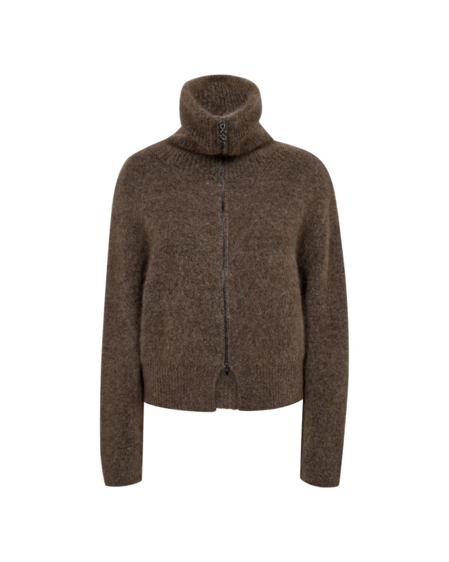 Denne cardigan er fremstillet i en luksuriøs uldblanding med blød, børstet finish og høj hals. Tovejs-lynlåsen og det diskrete logo ved kraven tilføjer et moderne, sporty touch. Brug den lukket for et elegant look eller over en T-shirt for en afslappet hverdagsstil.