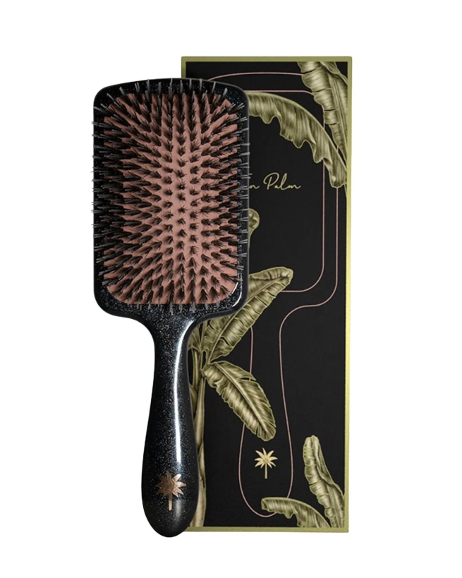 Denne Fan Palm-børste kombinerer lange nylonhår og bløde vildsvinehår, som skånsomt løsner håret, stimulerer hovedbunden og fordeler de naturlige olier for ekstra glans og smidighed. Den forbedrede blodcirkulation ved hårsækkene kan samtidig reducere behovet for hyppig hårvask.