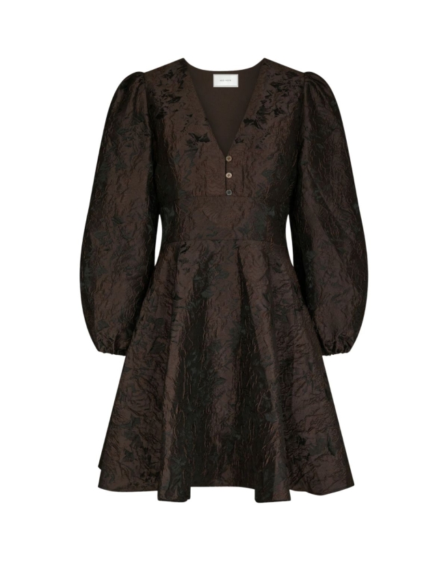 Kort kjole i brokadekvalitet med V-udskæring og dekorative knapdetaljer foran. Kjolen har en let taljeret pasform, der fremhæver silhuetten, og falder elegant over hoften – perfekt til festlige lejligheder.