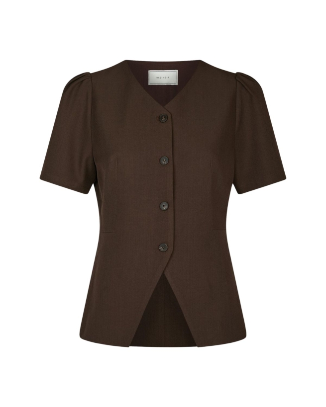 Denne langskårne, skræddersyede bluse har korte ærmer og knaplukning hele vejen ned, hvilket giver et klassisk og elegant udtryk. Den er perfekt til både formelle og mere afslappede looks, hvor et stilfuldt og raffineret touch ønskes.
