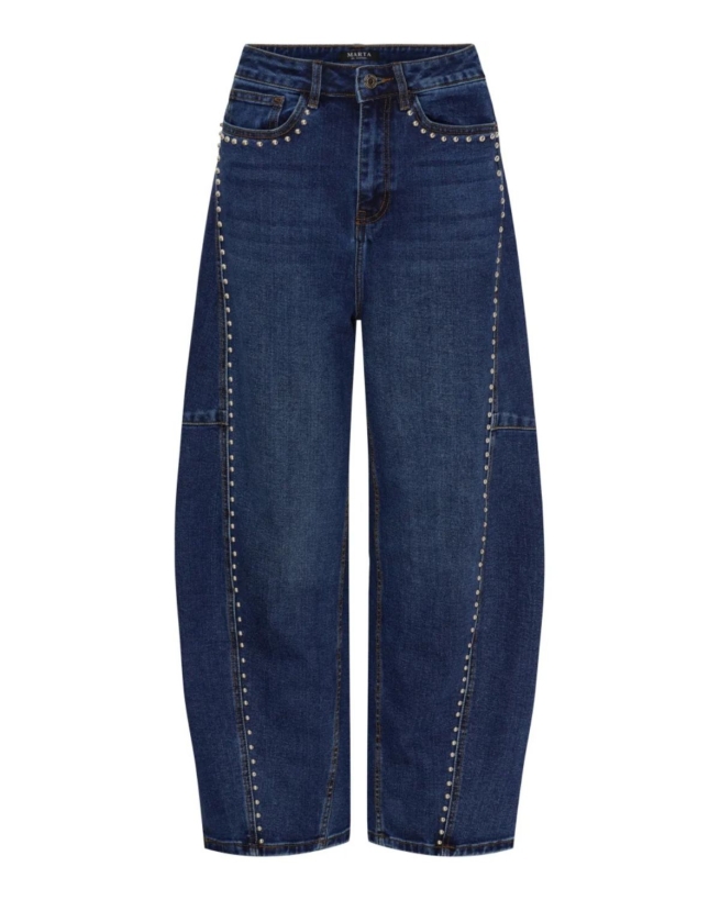 Cool baggy jeans fra Marta du Château med nitte-detaljer. Bukserne har knap- og lynlåslukning samt lommer foran og bag, hvilket gør dem både praktiske og stilfulde. Perfekte til ethvert outfit, uanset om de styles med en top og blazer, en strik eller skjorte.