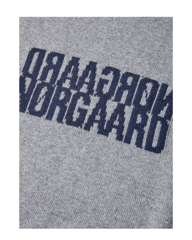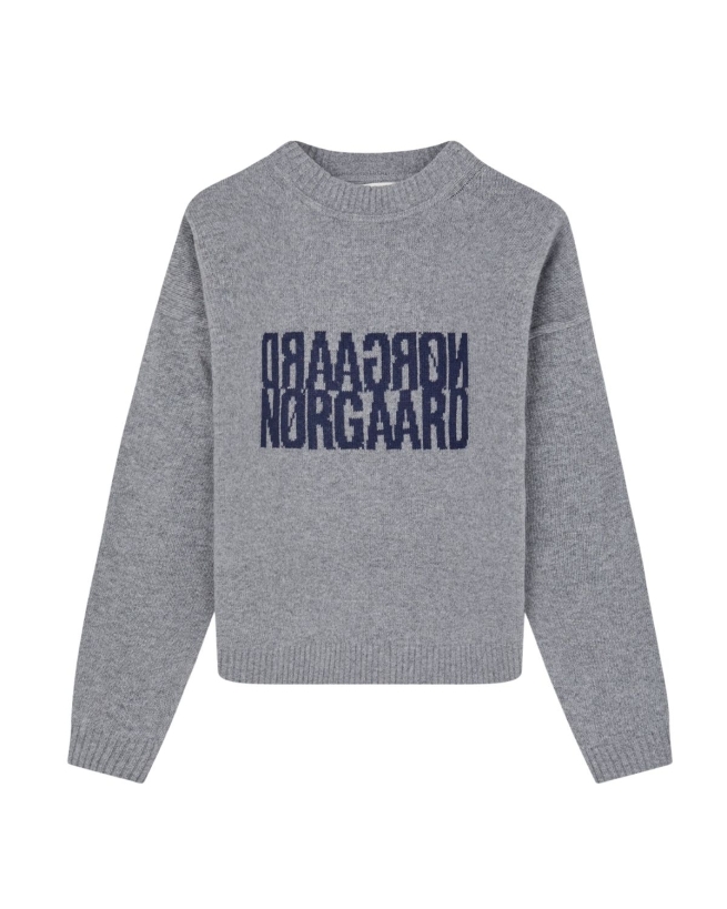 Loose striktrøje med hængende skuldre, lange ærmer og brede ribstrikkede kanter, der skaber en afslappet og komfortabel pasform. Et delvist spejlvendt logo strikket på brystet giver et moderne og stilfuldt touch.