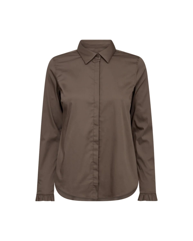 Denne bluse fremhæver femininitet med sin slanke, elegante silhuet og ultrabløde, strækbare materiale. Den klassiske krave og tidløse knaplukning foran kombineres med flæsemanchetter, der diskret titter frem under ærmerne og giver et sofistikeret touch. Perfekt til at style med mere strukturerede outfits for et elegant og detaljeret look.
