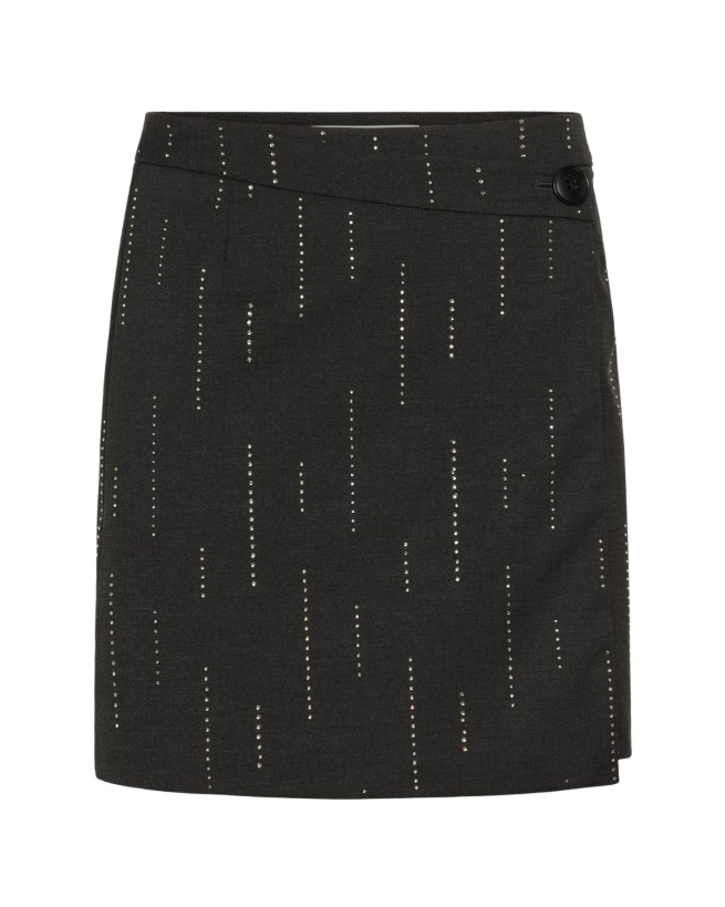 Mininederdel med asymmetrisk front og knapdetalje i taljen. Den er lavet i glat materiale med diskrete detaljer, der giver et moderne og struktureret udtryk.