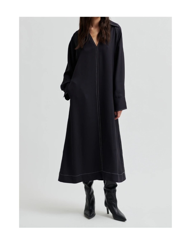 Maxikjole fra Second Female i en blød og draperet viskoseblanding med kontrastsyninger, der giver et elegant og struktureret look. Modellen har åben halsudskæring med stor krave, skjult lynlås i siden, skjulte sidelommer samt raglanærmer med knappede manchetter. Pasformen er tætsiddende og flatterende.