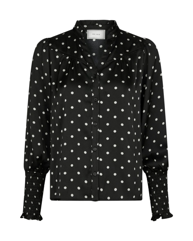 Feminin bluse med lange ærmer og et flatterende prikket print. Blusen har en klassisk, let rummelig pasform, der gør den perfekt til både hverdag og mere festlige lejligheder.
