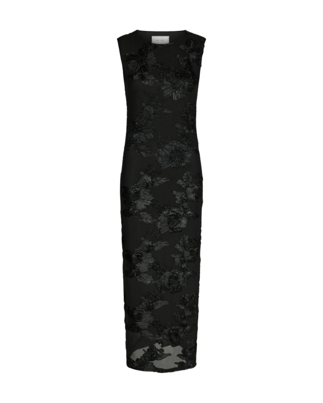 Smuk lang kjole i 3D blomster-mesh med gennemgående foring, der sikrer komfort og en elegant silhuet. Kjolen har en let tætsiddende pasform og falder smukt langs kroppen, hvilket gør den ideel til festlige lejligheder.