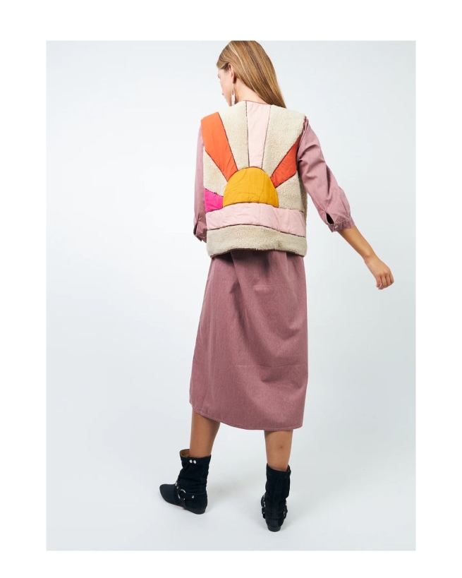 JadeLL vesten er en blød og hyggelig teddy-vest med fine kontrastkanter, lommer med quiltede detaljer og et stort solmotiv på ryggen, der giver et legende og personligt udtryk. Den rummelige pasform og unikke håndlavede applikation gør hver vest helt særlig – et perfekt eksempel på Lollys Laundrys farverige og kreative signatur.