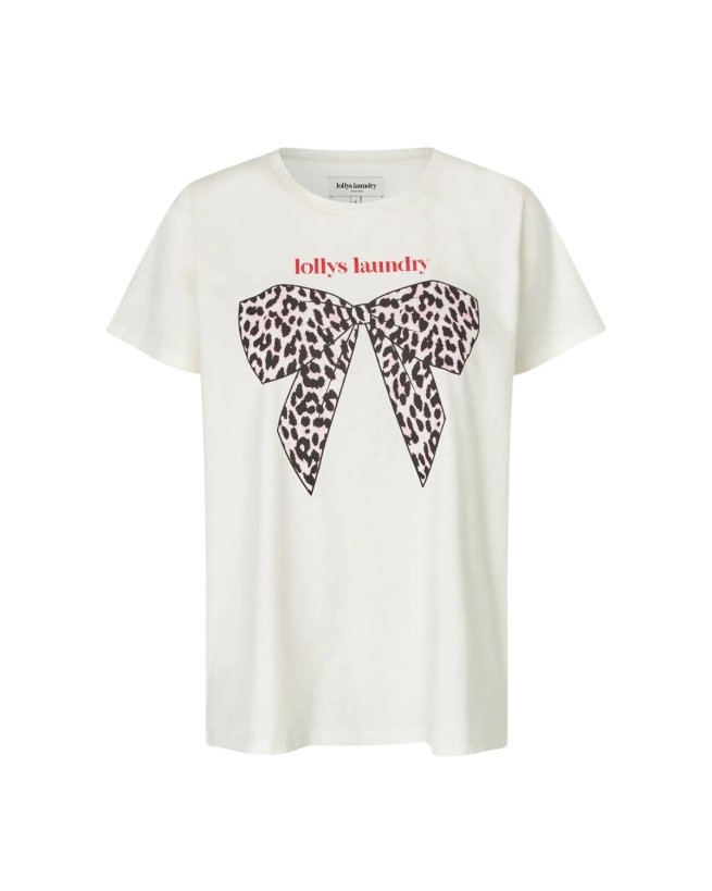RomaLL T-shirten er en klassisk hvid T-shirt i blød bomuld med rund hals og korte ærmer. Den har et stort leopardmønstret sløjfeprint foran og rød Lollys Laundry logo-detalje – perfekt til både hverdagsbrug og under en blazer eller cardigan.