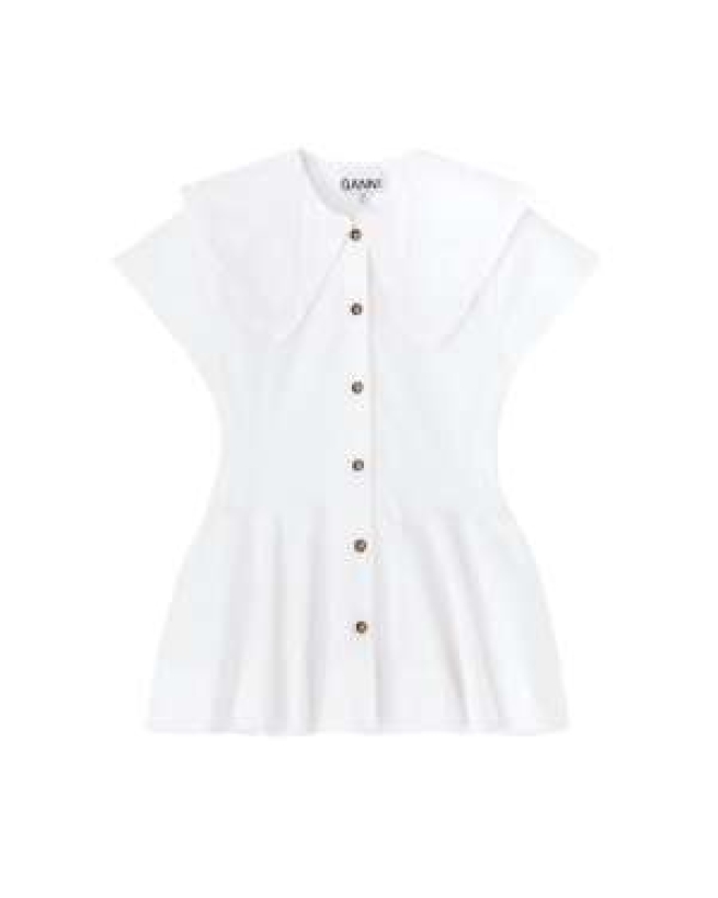 Let og feminin skjorte med krave med flæsekanter, korte ærmer og knaplukning foran. Skjorten har kant med vidde, der giver et elegant og luftigt udtryk.Materiale: 97% Organic Cotton, 3% Elastane